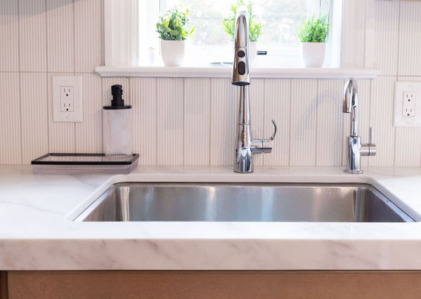 This kitchen showcases the elegance of Symphony Sharp luxury quartz with a 2" mitered edge, crafted from crystalline-silica-free materials for a safe and sophisticated finish. Sleek island cabinets and warm wood tones complement the quartz, while a vertical tile backsplash ties the contemporary design together, creating a space that is both striking and functional.
